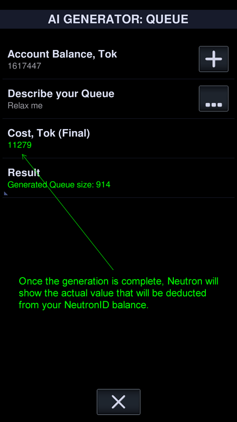To support the advanced capabilities of the Google Gemini 2.5 Flash engine, the AI Queue Generation service operates on a transparent, token-based system. Each generation utilizes a specific amount of "Tok" (tokens), reflecting the computational resources and valuable work performed by the AI engine. You can conveniently purchase tokens within the app to continue enjoying this powerful feature. Rest assured, the final cost in Tok will be clearly displayed before any deduction from your NeutronID balance, ensuring complete transparency.