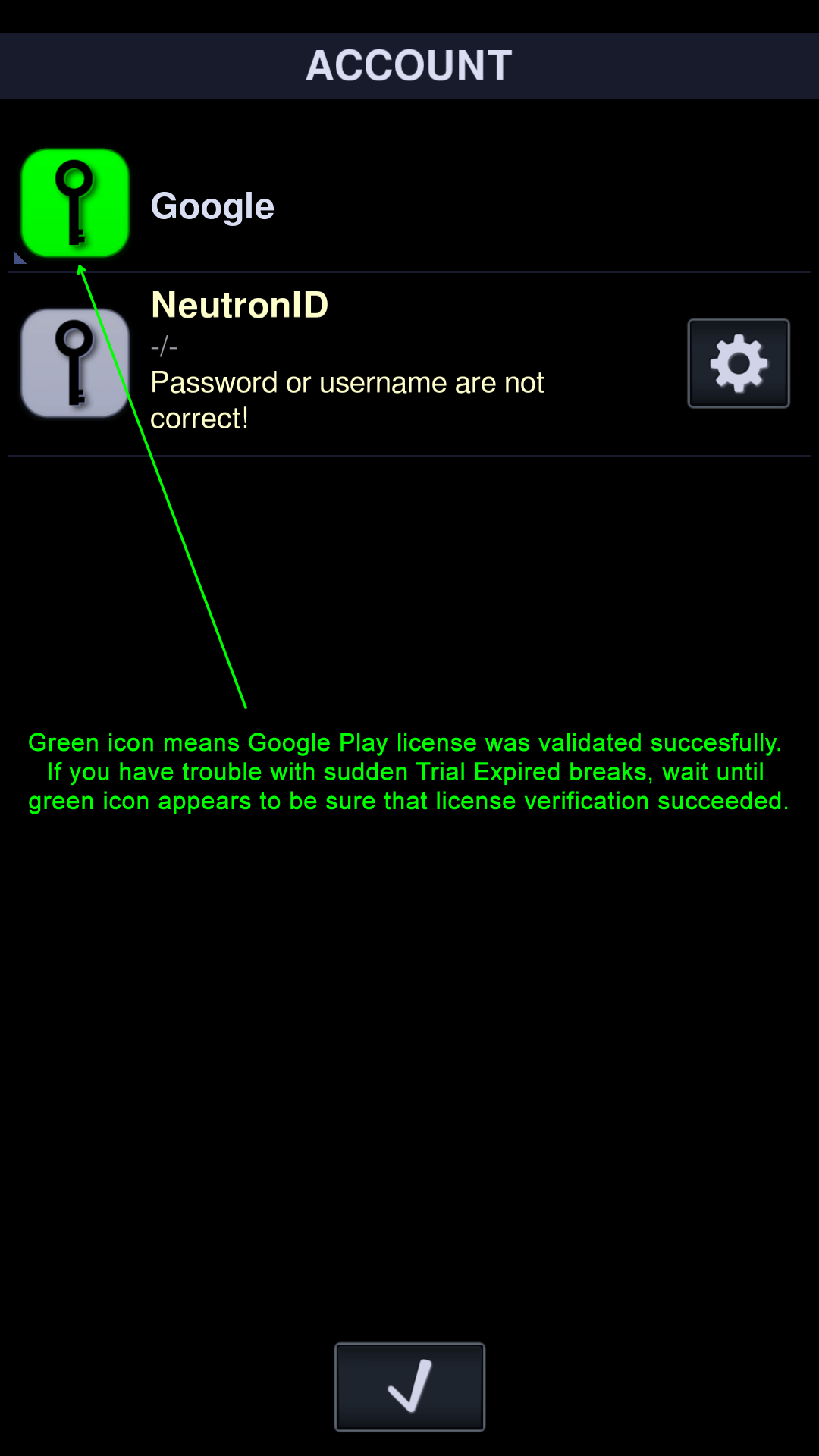 Note! Google Play license check does not work on Android devices without Google Play services installed. Earlier purchased applications will not be able to check license in Google Play and will behave as not purchased. If Google Play services can not be installed on such device to overcome this limitation and be able to use Neutron you could follow this FAQ answer.