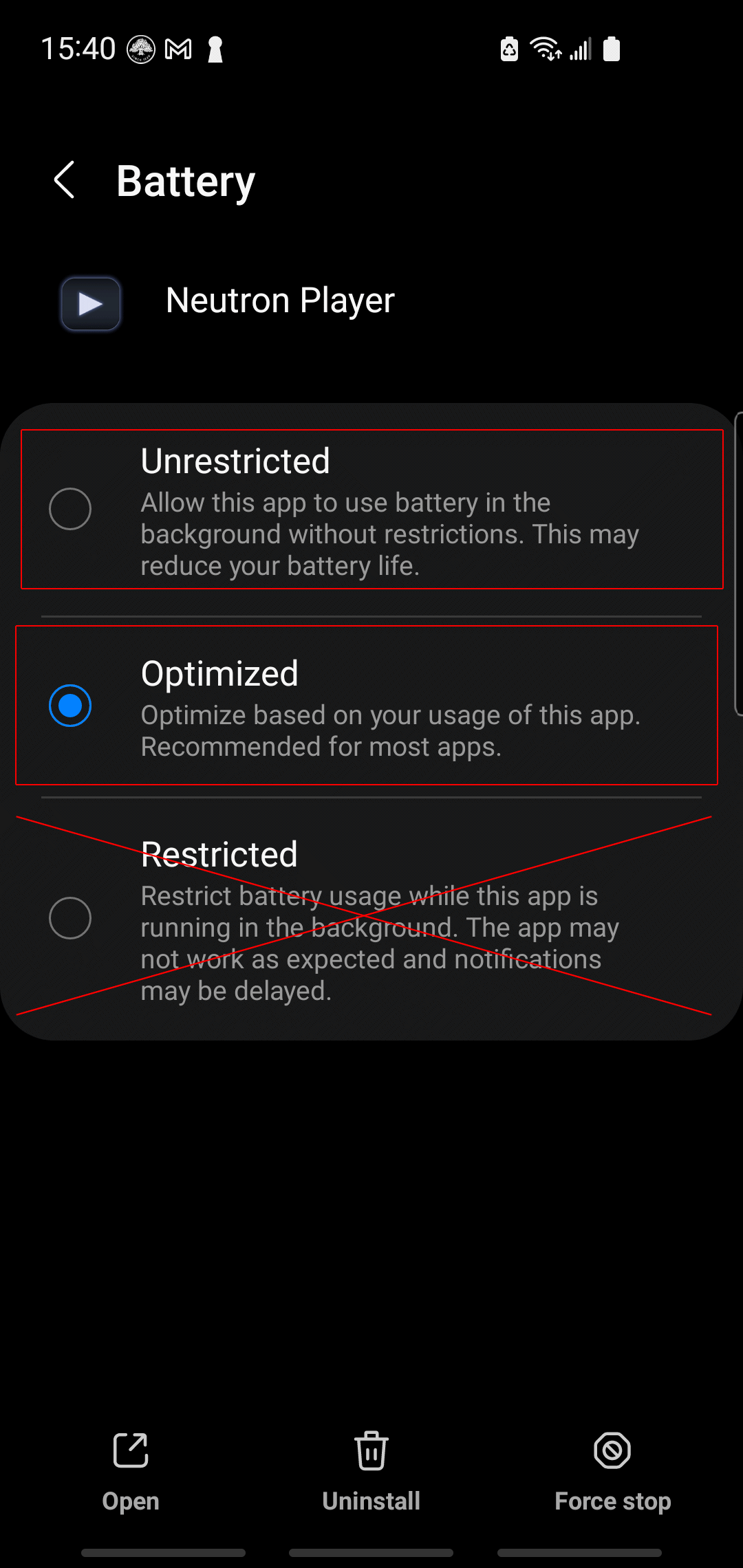 - Go to OS settings → Apps → Neutron Player/Neutron Recorder → Battery optimization → select Not Optimized