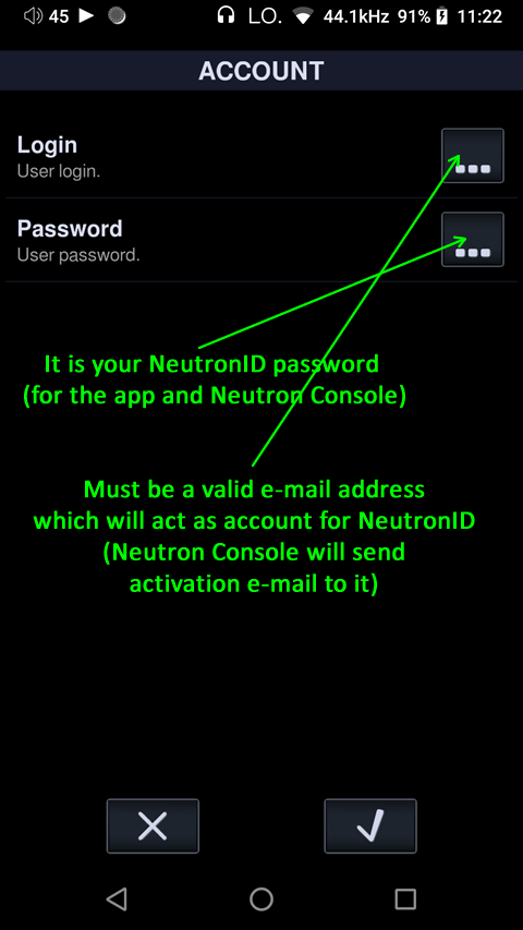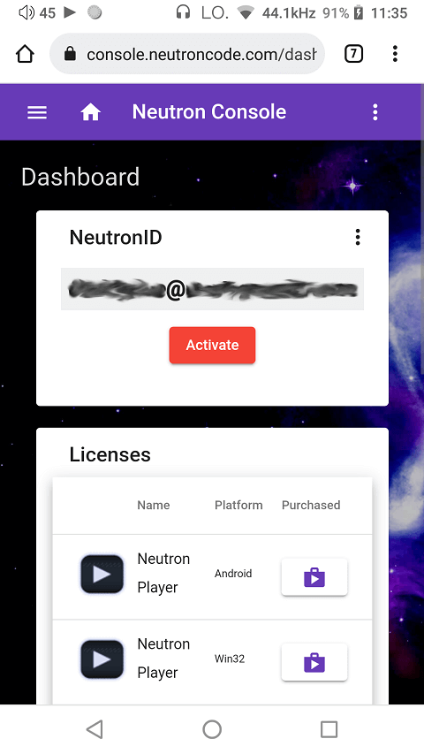 A: Neutron Console manages various functionality of your Neutron app: lists active licenses (purchased ONLY via PayPro) and subscriptions, allows to backup/restore settings of your device. To access Neutron Console you need NeutronID. NeutronID is your e-mail address which you use to login to Neutron Console.
