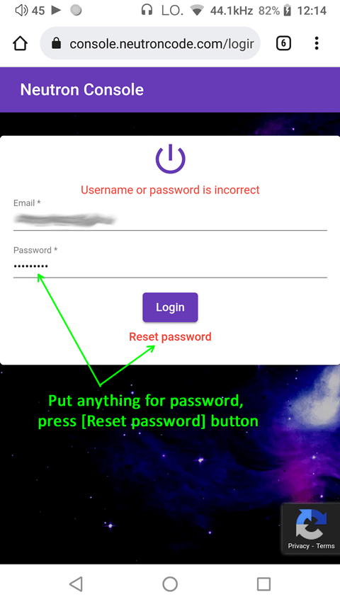 • If you forgot password of your NeutronID or did not receive activation e-mail, you can always force activation again manually by trying to login with your NeutronID and any password (just type 123) in order to get [Reset password] button shown up. Press [Reset password] button, put your NeutronID in both fields and press Submit. After that you will get an activation e-mail from Neutron Console: